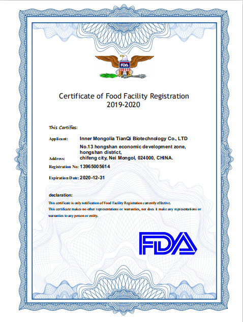 熱烈慶祝天奇生物天奇生物HACCP認證、ISO22000體系認證、FDA認證復審成功。天奇生物作為集多肽食品原料、現代食品和保健食品研發、生產和銷售為一體的現代化企業,對生產食品安全衛生質量控制、建立關鍵控制點對危害進行控制,消除食品安全危害,確保食品在消費的生產、加工、制造、準備和食用等過程中的安全等方面一直不懈努力并獲得中國質量認證中心的全面肯定。不僅致力于國內大健康產業的拓展和銷售,同時積極開拓海外市場獲得FDA認證,這也標志著天奇生物相關產品被相關部門認定,確保食品供應安全、干凈、新鮮并且標識清楚。注:(天奇生物自成立不久便獲得相關資質認證,此次為復審。)